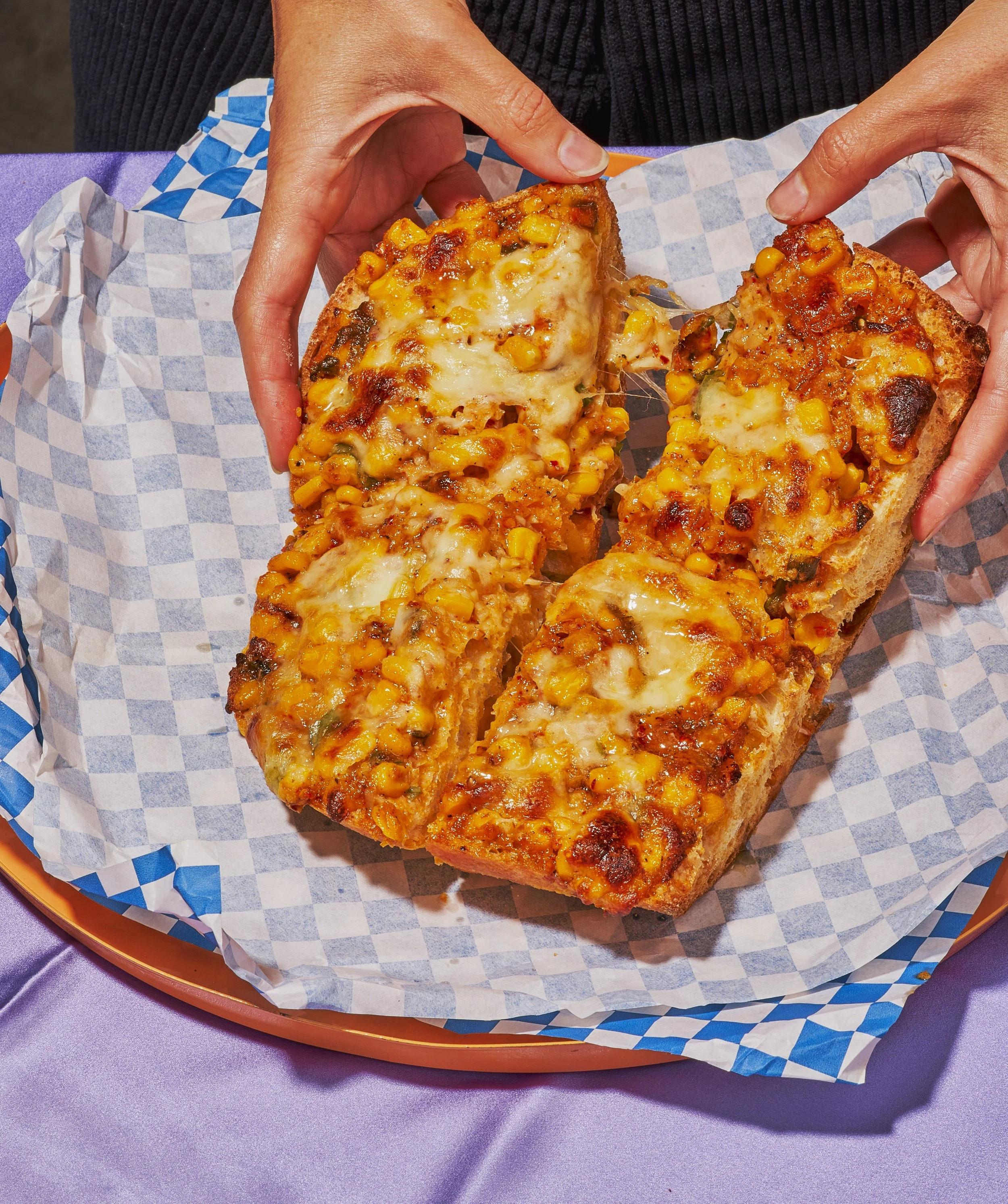 The garlicky corn cheese paste is super jammy, and you can really slather it on anything, such as naan or pizza dough. But hearty bread like ciabatta can really handle the thick layer of jammy paste here.